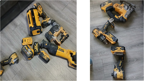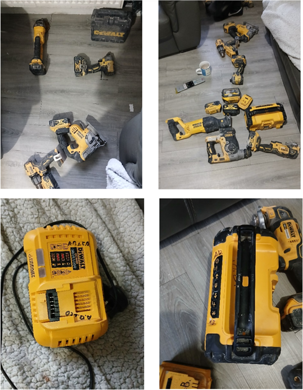Items recovered include several drills (impact, hammer and combi), angle grinders, a jigsaw, a reciprocating saw and multi-tools. A number of the tools have a distinctive ‘AB Ltd’ written on them and some have ‘Joe’. Most are branded Dewalt and Festool.