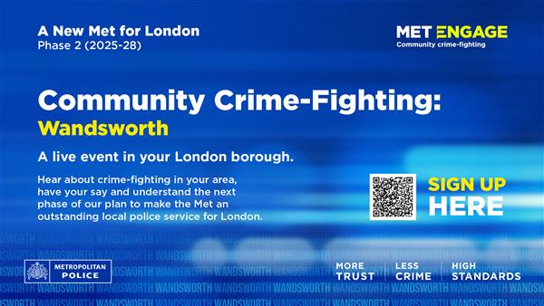 Please find attached flyer inviting you to attend the Metropolitan Police New Met for London Community Crime fighting Event on 14th October 1800-2030hours at Arding & Hobbs, 7 Saint John's Road, London SW11 1QN Please scan the QR code on the flyer to reserve your place Look forward to seeing you there Regards | ||