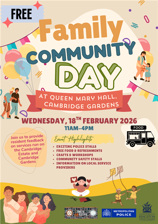 Family Community Day will take place at Queen Mary Hall in Cambridge Gardens on 18th February 2026 between 11:00am and 16:00. Please find attached the leaflet that includes details of the event.