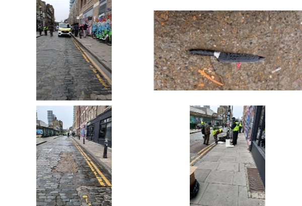Upon arrival of Tower Hamlets Taskforce and council THEOs the street Sclater Street / Fusion Court was cluttered with illegal street trading and very well-known class A users on both sides of the pavements.