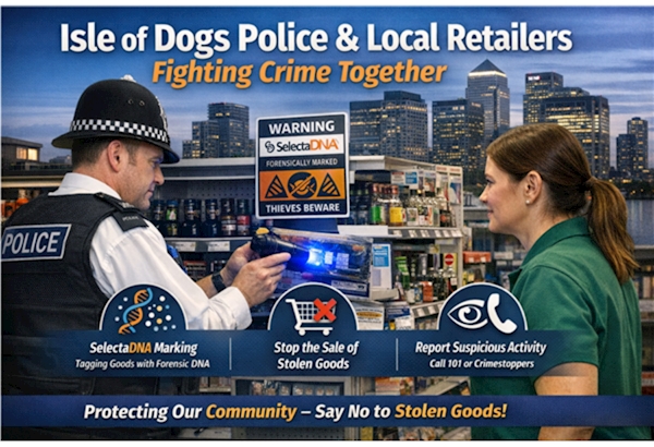 The Isle of Dogs police teams are working closely with local retailers on a new initiative aimed at reducing shoplifting and tackling the sale of stolen goods. By introducing SelectaDNA property‑marking technology across participating shops, officers and businesses are taking a proactive, evidence‑driven approach to crime prevention. This partnership is already building confidence among retailers and helping ensure that offenders know the Isle of Dogs is not a place to profit from theft. What Is SelectaDNA?SelectaDNA is a forensic marking system used worldwide to deter theft and help police trace stolen property or identify offenders. It combines synthetic DNA coding with microdot technology, creating a unique identifier that can be applied to individual products or assets. Each marking solution: SelectaDNA is widely adopted because it not only deters crime but also provides strong forensic evidence linking suspects to crime scenes. Police forces across the UK use it to support successful investigations. How Retailers on the Isle of Dogs Are Using ItLocal shops participating in the initiative are applying SelectaDNA to high‑value or frequently targeted products. They are also placing visible deterrent labels on marked goods—something proven to make thieves think twice, as offenders know the risk of being caught is significantly higher. Retail staff can also use SelectaDNA‑enabled defence sprays in certain circumstances to tag offenders during a theft. These microscopic traces remain detectable long after an incident, allowing police to link a suspect to a specific location. By working together, retailers and police are creating an environment where handling or reselling stolen goods becomes increasingly difficult and risky. Why This Matters for ResidentsThis initiative isn’t just about supporting businesses—it’s about protecting the whole community. When stolen goods circulate locally, it fuels further theft, anti‑social behaviour, and organised criminal activity. By making it harder for offenders to profit, we reduce crime overall and create a safer living and shopping environment for everyone. SelectaDNA has been shown to reduce burglaries and theft by up to 83% in some police projects, demonstrating its effectiveness as a long‑term prevention tool. How You Can Help: Spotting and Reporting Suspicious ActivityResidents play a crucial role in keeping the Isle of Dogs safe. You can support the initiative by reporting: If something doesn’t feel right, trust your instincts. Your information could help retrieve stolen property or identify those responsible. You can report suspicions by contacting Police on 101, via Crimestoppers anonymously, or by speaking directly with your local Safer Neighbourhoods Team. Working Together for a Safer Isle of DogsThe partnership between Isle of Dogs police teams and local retailers shows how community‑led policing can make a real difference. SelectaDNA gives businesses and officers powerful tools to deter crime, secure convictions, and protect what matters—while residents play an essential part by staying alert and reporting concerns. Together, we can make our community a place where criminals know they’re not welcome, and where shoppers and businesses feel safe and supported.