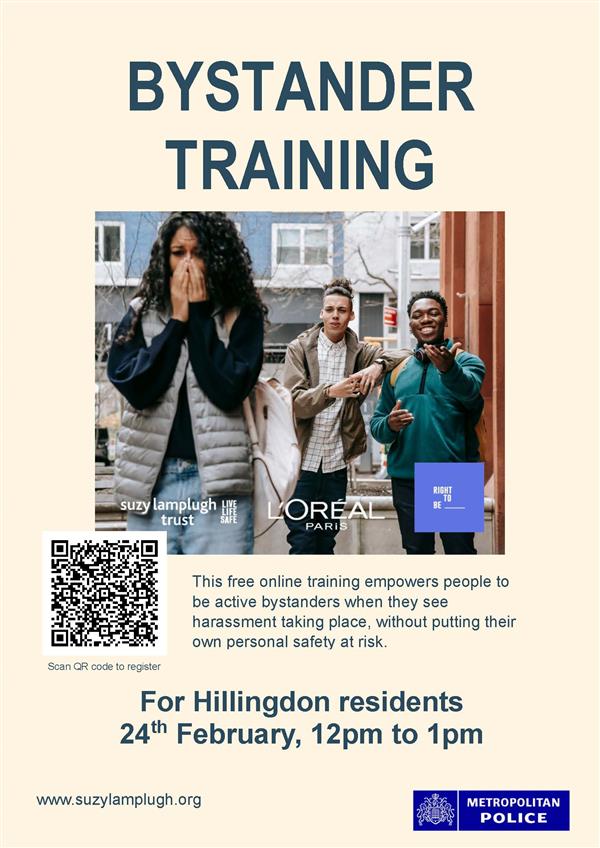 Dear residents,We’re sharing an opportunity for Hillingdon residents to take part in free online Bystander Training on 24th February, 12pm–1pm. This training is designed to empower people to safely and confidently intervene when they witness harassment, without putting their own safety at risk. It provides practical tools to help you recognise harmful situations and take appropriate action. The session is delivered in partnership with the Suzy Lamplugh Trust, L’Oréal Paris, and the Metropolitan Police. 📅 Date: 24th February Let’s work together to keep our community safer and more confident in looking out for one another. For more information: www.suzylamplugh.org | ||