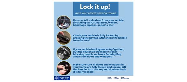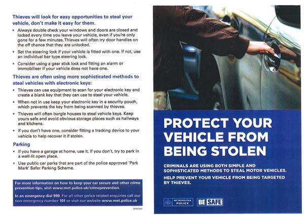 Please click onto the following links for further crime prevention advice: https://www.met.police.uk/cp/crime-prevention/keeping-vehicles-safe/ https://www.securedbydesign.com/guidance/crime-prevention-advice/vehicle-crime/car-security https://www.securedbydesign.com/guidance/crime-prevention-advice/vehicle-crime/key-programming https://www.securedbydesign.com/guidance/crime-prevention-advice/vehicle-crime/relay-theft