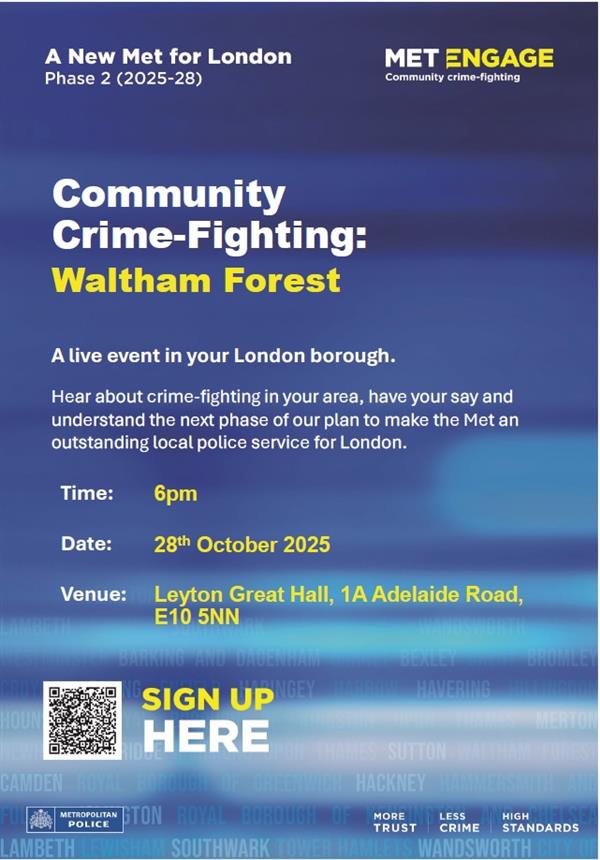 Hear about crime-fighting in your area, have you say and understand the next phase of our plan to make the Met an outstanding local police service for London. Please sign up to attend the event using the QR code on the image below or file attached