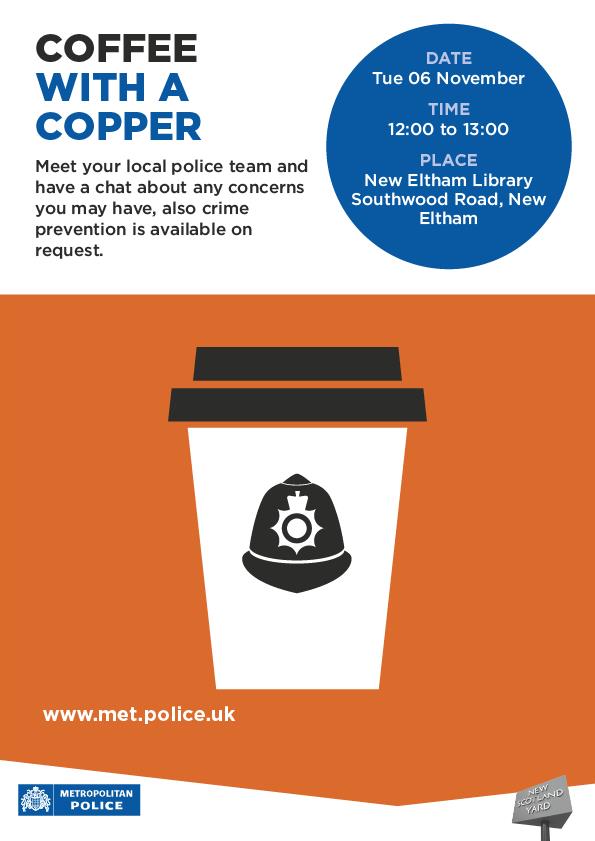 The local Police team will be holding a Cuppa with a Copper on the 6th November at the New Eltham Library from 12:00 to 13:00, please feel free to pop in and have a chat about any concerns you may have, crime prevention advice will be available on request.
