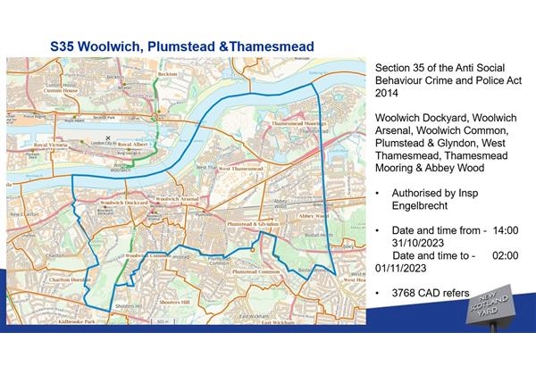 I have authorised a dispersal order for Woolwich, Thamesmead and parts of Plumstead starting at 14:00 today ( 31/10/2025 ) and ending at 0200 ( 01/11/2025). This is due to problems we have had in previous years.