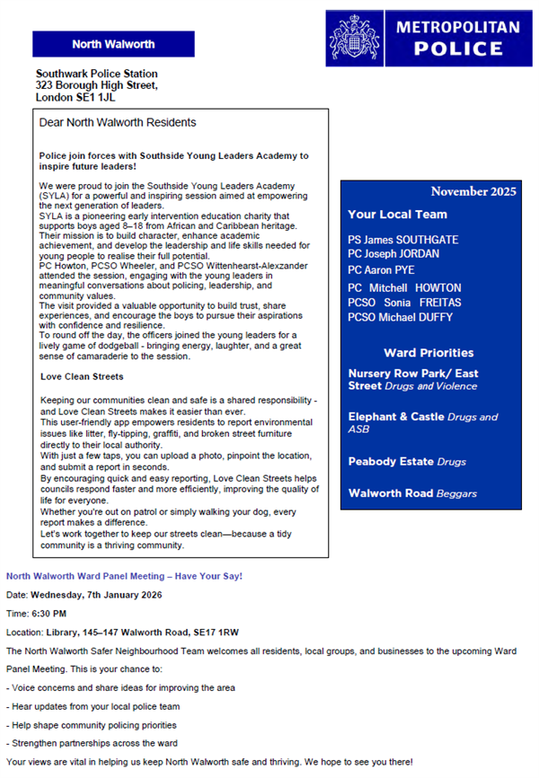 Please review the following update regarding Anti Social Behaviour which some members around this area have highlighted as an issue of concern on the Met Engage priority survey. NEWSLETTER FROM NORTH WALWORTH Antisocial behaviour can come in many forms and can require support from more organisations than just the police. There are 13 different types of antisocial behaviour that we may be able to help with, including abandoned vehicles, littering or drugs paraphernalia and street drinking. A full list of what we categorise as antisocial behaviour is available on our website.