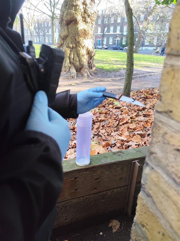 Whilst walking around Highbury Fields Officers located a knife stashed away behind a building, This has since been seized and sent for destruction.