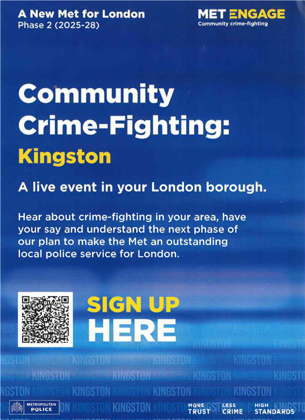 This three hours event will bring together residents, business owners, partners, and stakeholders from across the borough to discuss Kingston’s local policing priorities and the progress we have made in response to community concerns. The Deputy Commissioner, alongside our Superintendent and borough Inspectors, will present the latest crime data, highlight successful initiatives, and outline how we are continuing to deliver the Met’s plan for a safer Kingston.